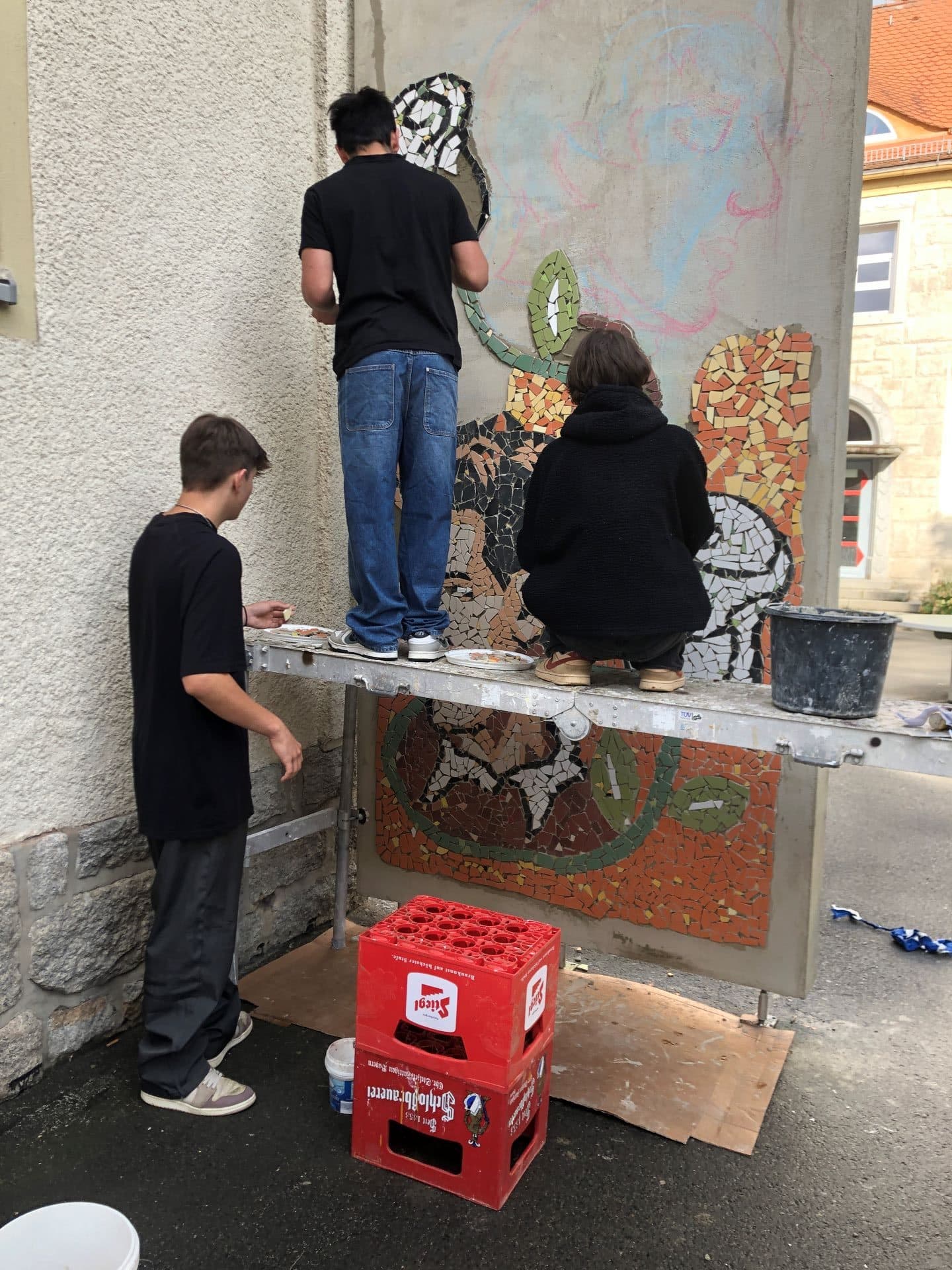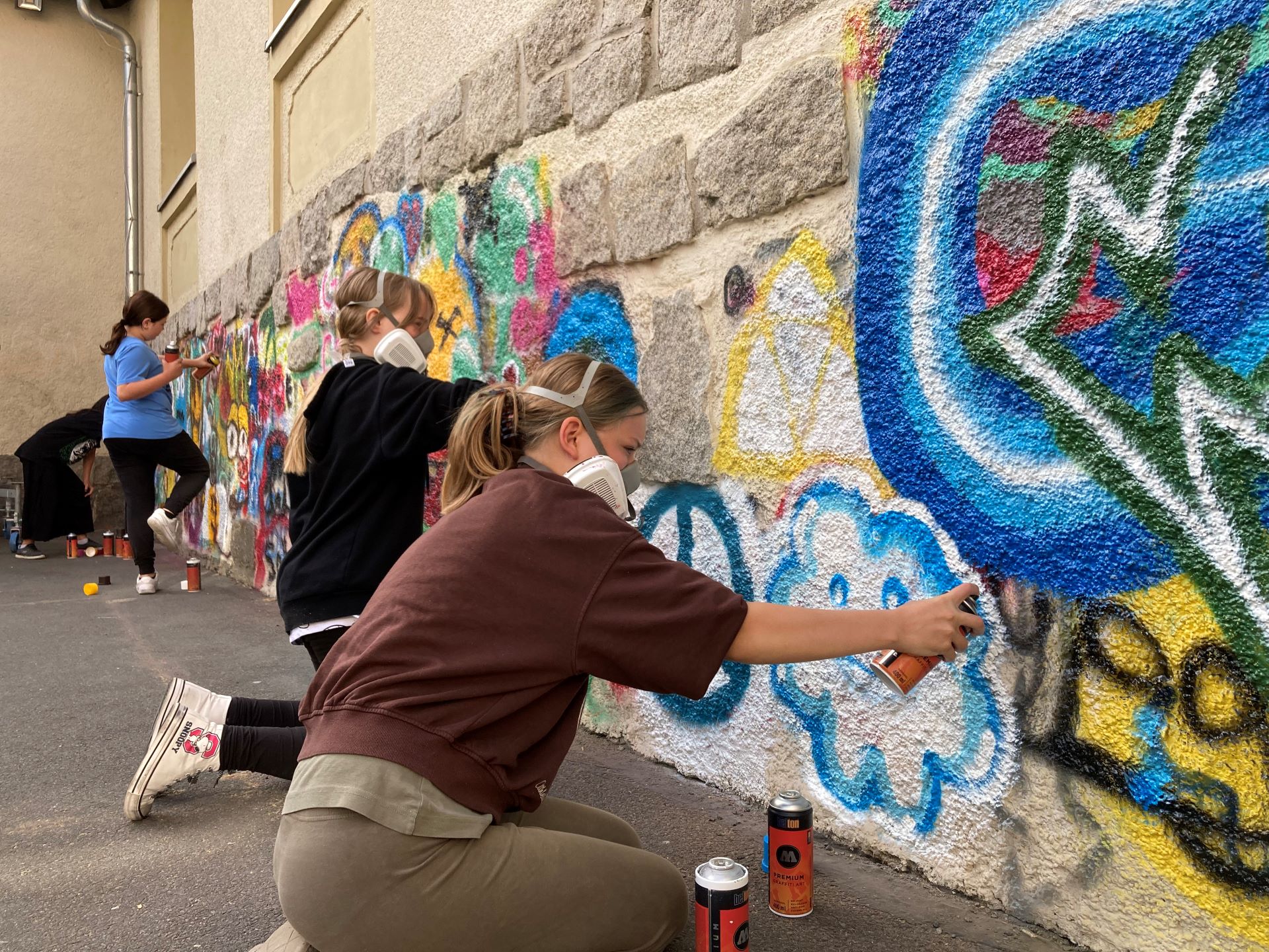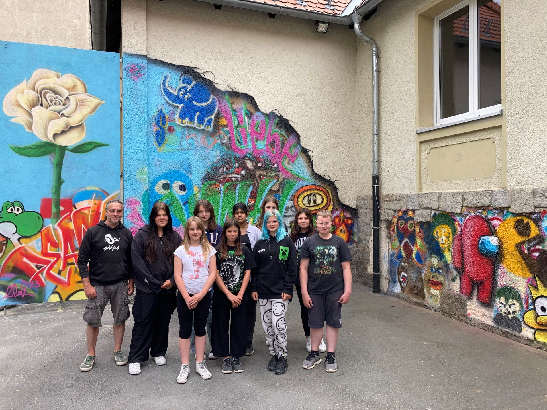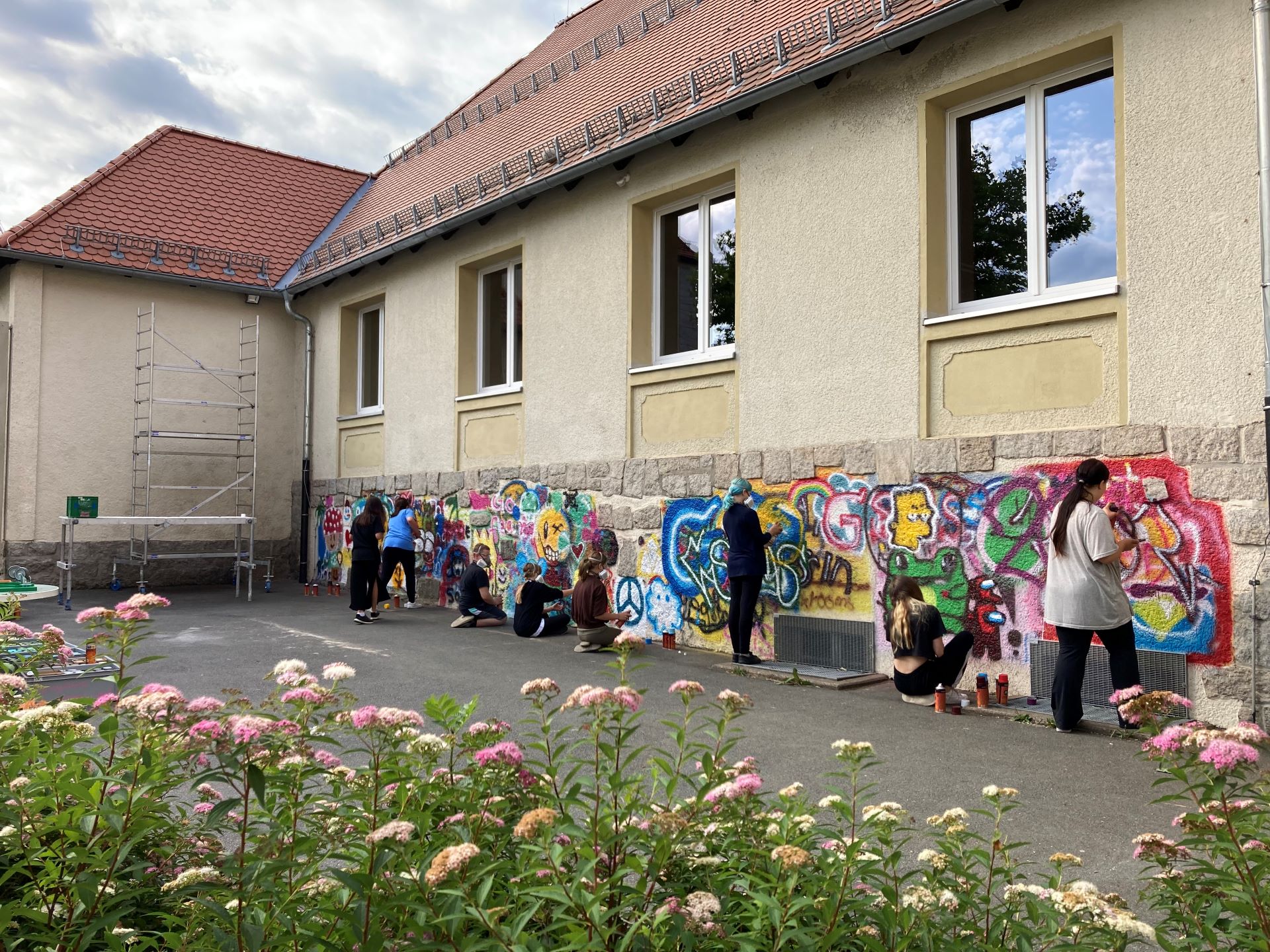 Vor 80 Jahren wurden Hans und Sophie Scholl, Mitglieder der Widerstandgruppe „Weiße Rose“ von den Nationalsozialisten hingerichtet. Die Geschwister Hans und Sophie Scholl, Namensgeber der Mittelschule in Schwarzenbach an der Saale, stehen für einen mutigen Widerstand, für Menschlichkeit, Freiheit und Toleranz. Anlässlich des 80. Jahres- und Gedenktages gestalteten die Schüler:innen an neun Projekttagen ein großes Wandbild an der Außenfassade der Schule und zeigten, wie wichtig die Erinnerung an die Widerstandgruppe „Weiße Rose“ und ihre Werte auch heutzutage sind. Mit der Künstlerin Annette Hähnlein entwarfen sie an einer Außenwand ein Mosaikbild mit dem Portrait der Geschwister. Das beeindruckende Ergebnis überraschte einige der Schüler:innen positiv, sie konnten sich während des Arbeitsprozesses kaum vorstellen, dass aus den kleinteiligen Mosaiksteinen ein solches großformatiges Portrait entsteht. Das Symbol der weißen Rose findet sich auch im Graffiti, das unter Anleitung des Künstlers Michael Schoberth entstanden ist, wieder. Daneben blieb an der Fassade neben dem Eingangsbereich aber auch viel Raum für eigene Ideen und Motive. Ein großflächiges Mural, an dem die jungen Künstler:innen tagelang gemeinsam arbeiteten, erstreckt sich über die komplette Wand. Comic- und Videospielfiguren wie Yoshi, Pac-Man oder die Simpsons spielen in der kreativen Arbeit genauso eine Rolle wie die Schriftzüge „Liebe“, „Peace“ oder „Yeah“.