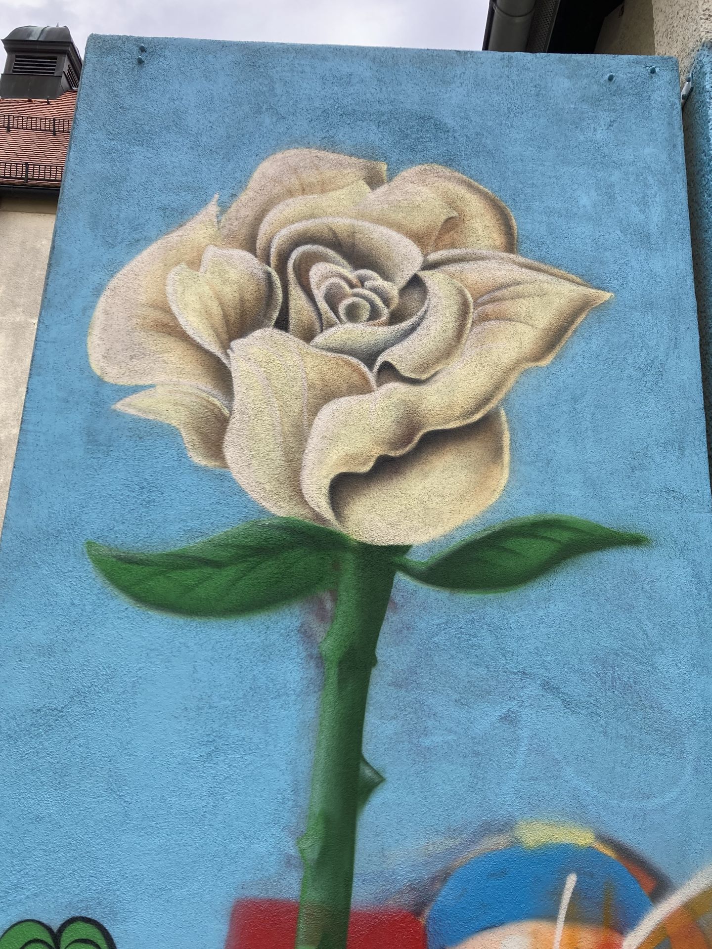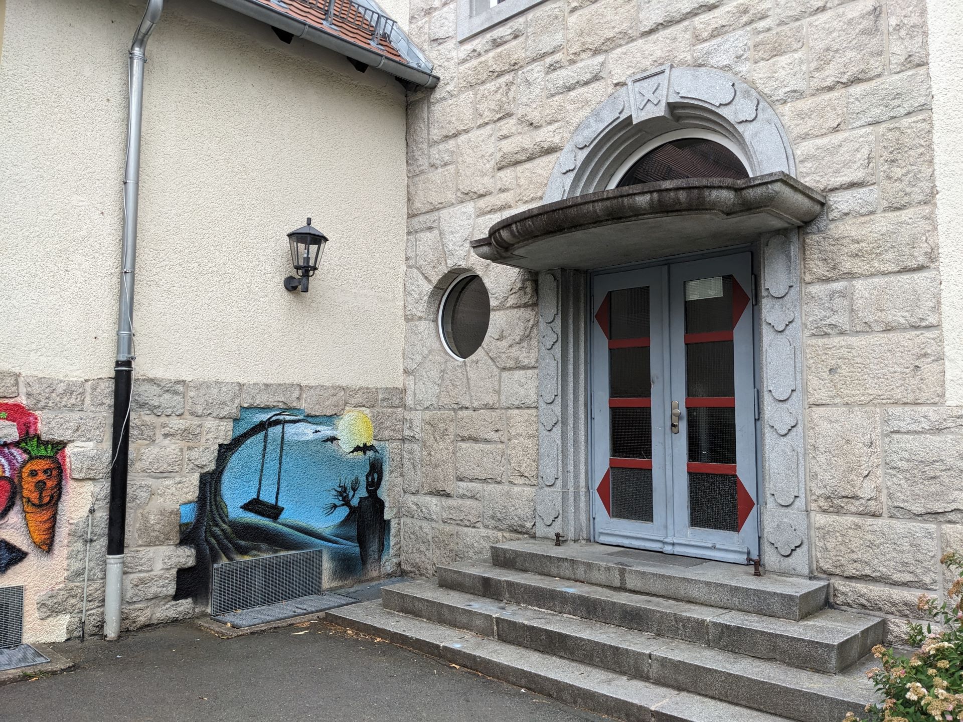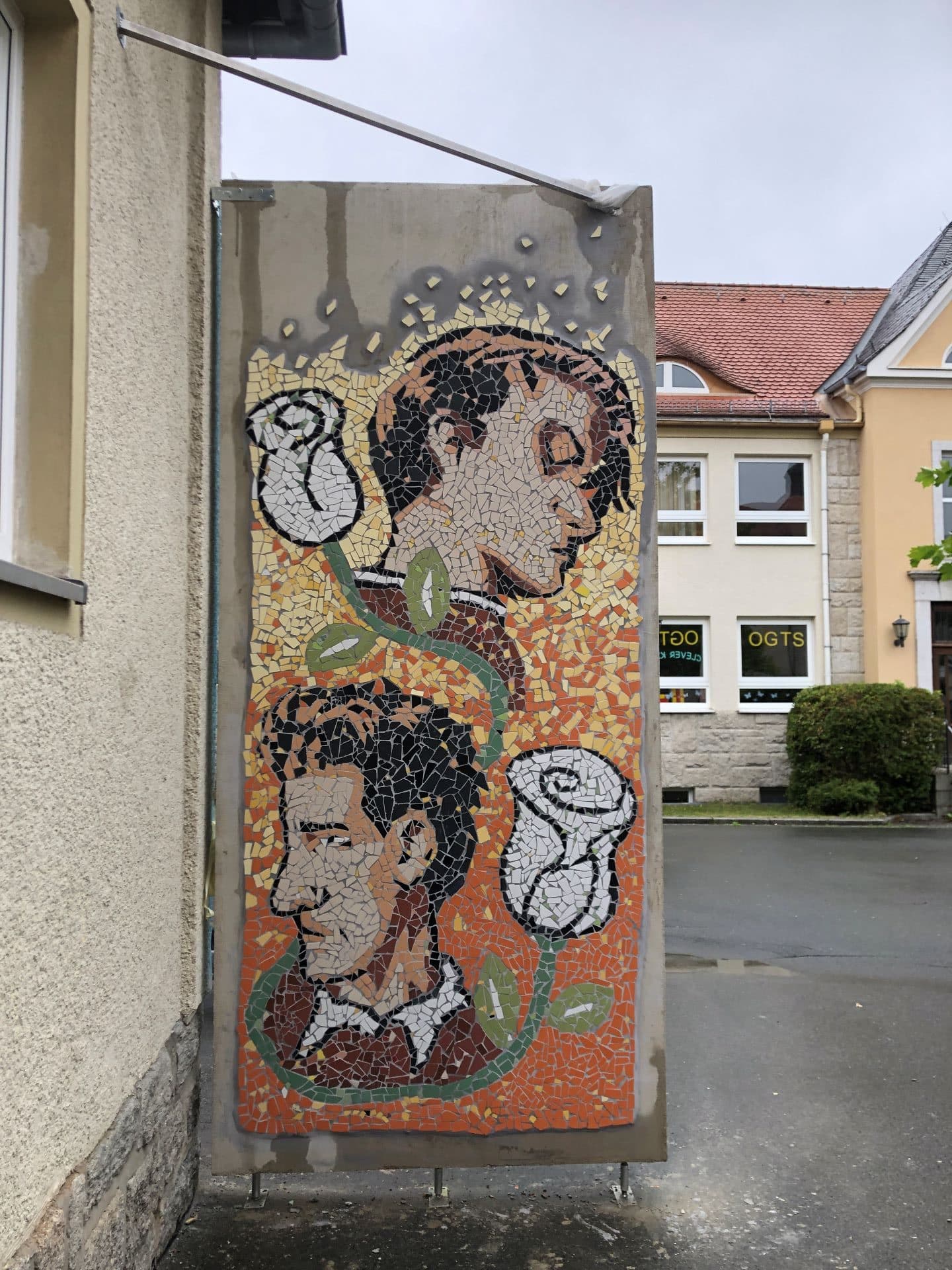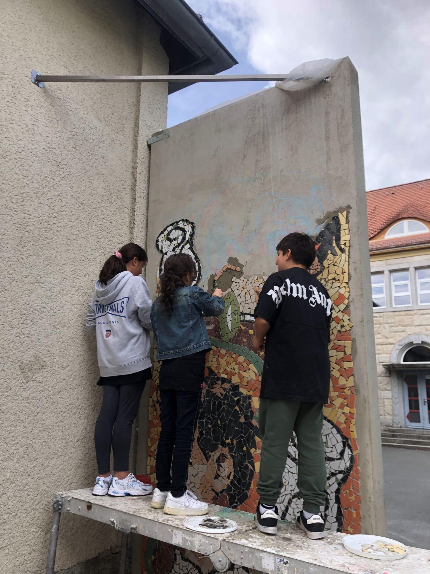 Vor 80 Jahren wurden Hans und Sophie Scholl, Mitglieder der Widerstandgruppe „Weiße Rose“ von den Nationalsozialisten hingerichtet. Die Geschwister Hans und Sophie Scholl, Namensgeber der Mittelschule in Schwarzenbach an der Saale, stehen für einen mutigen Widerstand, für Menschlichkeit, Freiheit und Toleranz. Anlässlich des 80. Jahres- und Gedenktages gestalteten die Schüler:innen an neun Projekttagen ein großes Wandbild an der Außenfassade der Schule und zeigten, wie wichtig die Erinnerung an die Widerstandgruppe „Weiße Rose“ und ihre Werte auch heutzutage sind. Mit der Künstlerin Annette Hähnlein entwarfen sie an einer Außenwand ein Mosaikbild mit dem Portrait der Geschwister. Das beeindruckende Ergebnis überraschte einige der Schüler:innen positiv, sie konnten sich während des Arbeitsprozesses kaum vorstellen, dass aus den kleinteiligen Mosaiksteinen ein solches großformatiges Portrait entsteht. Das Symbol der weißen Rose findet sich auch im Graffiti, das unter Anleitung des Künstlers Michael Schoberth entstanden ist, wieder. Daneben blieb an der Fassade neben dem Eingangsbereich aber auch viel Raum für eigene Ideen und Motive. Ein großflächiges Mural, an dem die jungen Künstler:innen tagelang gemeinsam arbeiteten, erstreckt sich über die komplette Wand. Comic- und Videospielfiguren wie Yoshi, Pac-Man oder die Simpsons spielen in der kreativen Arbeit genauso eine Rolle wie die Schriftzüge „Liebe“, „Peace“ oder „Yeah“.