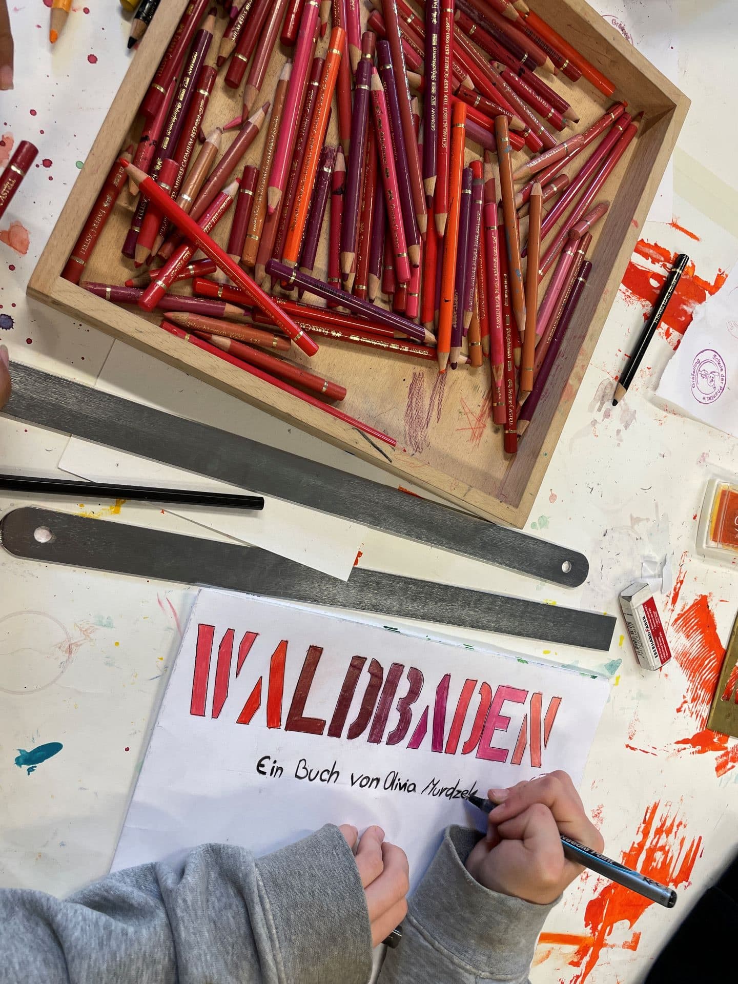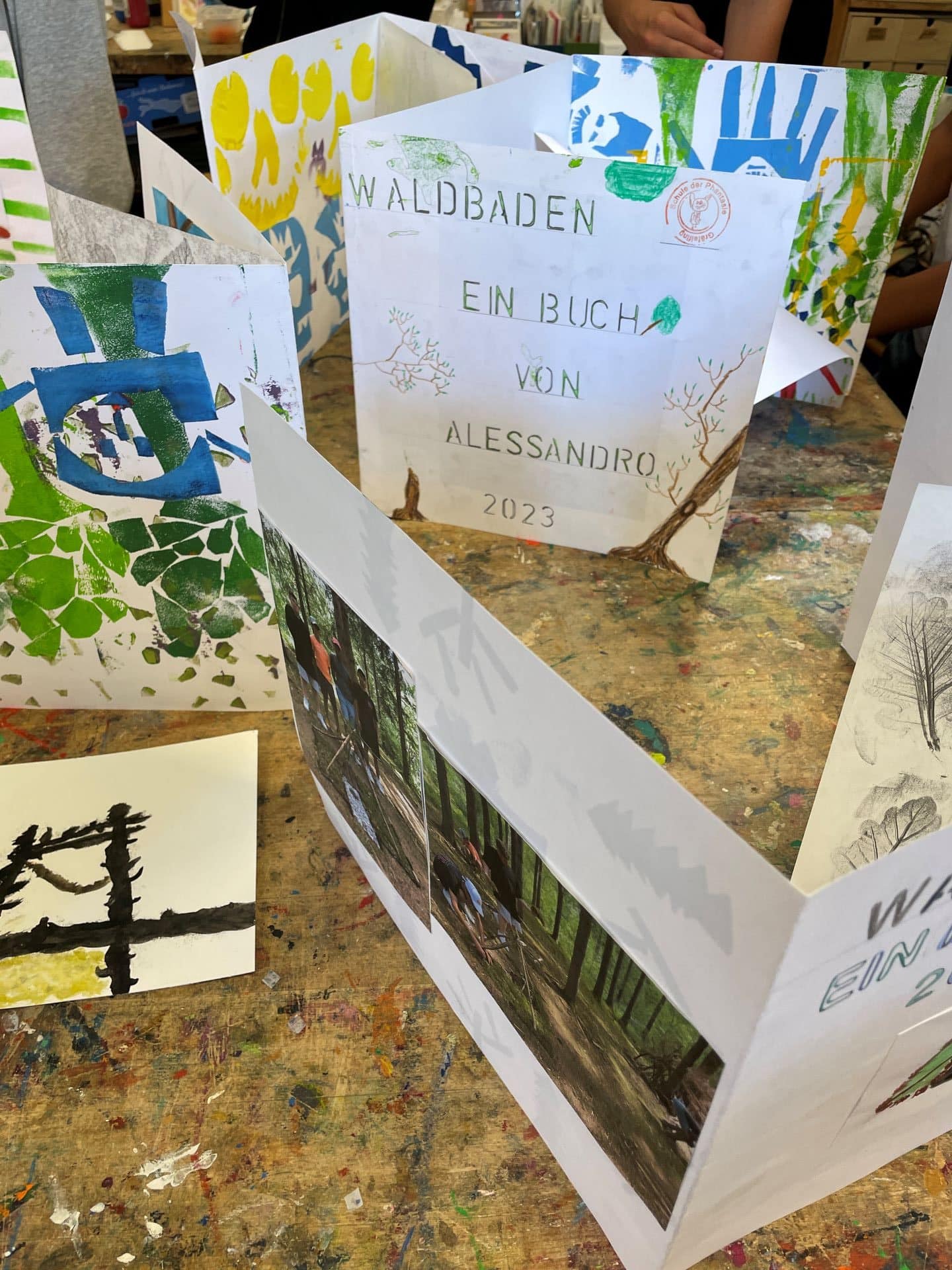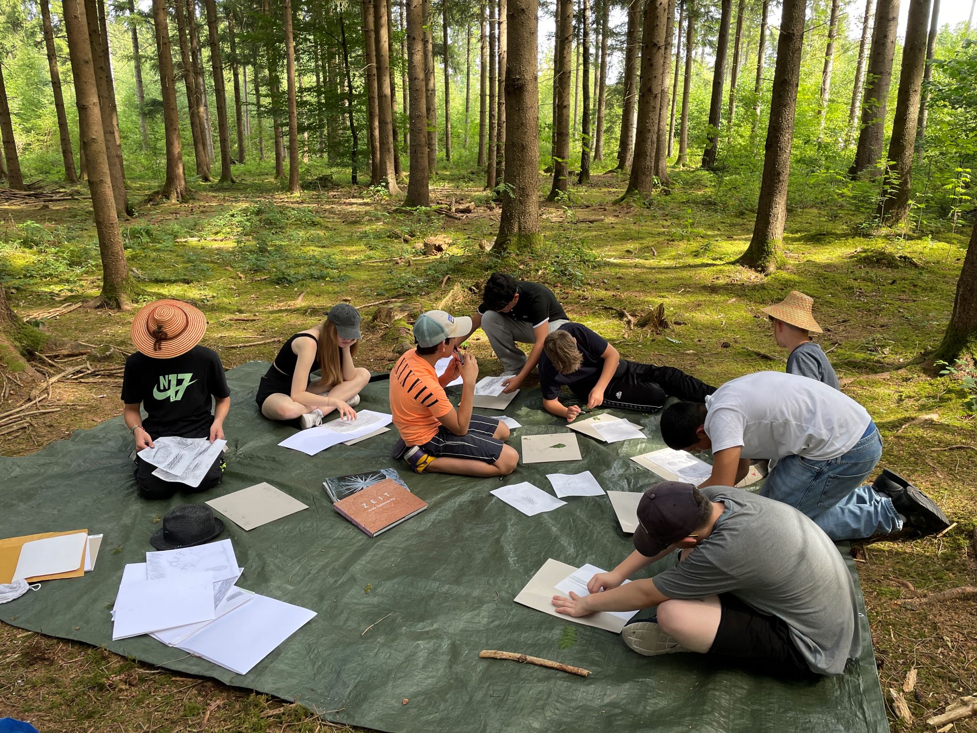 Zwei integrative sechste Klassen der Mittelschule Lochham nahmen mit der Schule der Phantasie Gräfelfing an einem kreativem Naturerlebnis teil. Je fünf Projektvormittage boten Zeit, die Natur vor Ort, den Wald und den Fluss Würm neu zu entdecken und zu beobachten und aus Naturmaterialien Kunstwerke zu gestalten. Die Schüler:innen wurden animiert Kunst und Natur zusammenzudenken und eigene Landart Objekte zu kreieren. In verschiedenen kleineren Aktionen und Übungen sammelten, beobachteten und zeichneten sie Blätter und Pflanzen, erfanden und druckten fantasievolle Waldwesen, trugen Naturmaterialien wie Stöcke, Zapfen und Moos zusammen und verwandelten sie in Interventionen zwischen den Bäumen. In individuellen Werkstattbüchern fanden Zeichnungen, Rinden-Frottagen, Aquarelle zu den selbst gebauten Orten im Wald und die gedruckten Waldgeister Platz. Durch Gruppenarbeiten entstanden im Laufe der Zeit gelungene Gemeinschaftswerke, die in kleinen Ausstellungen vorgestellt und fotografisch dokumentiert wurden.